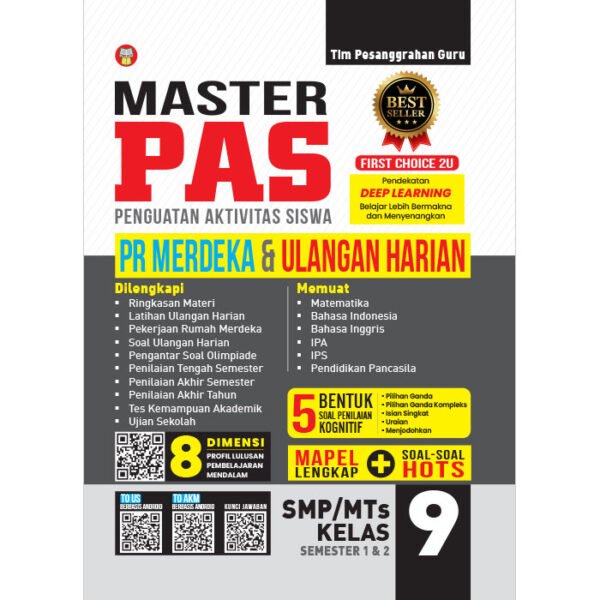 Buku “MASTER PAS (Penguatan Aktivitas Siswa) PR MERDEKA & ULANGAN HARIAN untuk SMP/MTs Kelas 9 Fase D Semester 1 & 2” ini dirancang khusus untuk membantu siswa mempersiapkan diri lebih dini menghadapi ulangan harian dengan berlatih mengerjakan soal. Sesuai dengan judul bukunya, di dalam buku ini memuat dua rubrik soal, yaitu Latihan Ulangan Harian dan Pekerjaan Rumah. Soal Latihan Ulangan Harian merupakan kumpulan soal yang dikerjakan di sekolah dengan bimbingan guru, sedangkan soal Pekerjaan Rumah (PR) merupakan kumpulan soal yang dikerjakan di rumah dengan bimbingan orang tua/wali. Tidak hanya sekadar menyajikan kumpulan soal, buku ini juga memberikan panduan yang komprehensif sehingga terbentuk pemahaman konsep yang benar terhadap materi pelajaran. Buku ini memuat mata pelajaran lengkap, meliputi Matematika, Bahasa Indonesia, Bahasa Inggris, IPA, IPS, dan Pendidikan Pancasila. Setiap mata pelajaran tersusun atas Ringkasan Materi, Latihan Ulangan Harian, dan Pekerjaan Rumah. Buku ini dilengkapi juga dengan kumpulan soal Penilaian Tengah Semester 1 dan 2, Penilaian Akhir Semester, Penilaian Akhir Tahun, Ujian Sekolah, dan Projek Penguatan Profil Pelajar Pancasila (P5). Konten P5 yang disajikan di dalam buku ini bertujuan untuk memberikan gambaran terkait tema dan topik yang dipilih sebagai projek, mulai dari tahap Perencanaan, Pelaksanaan, sampai Evaluasi terhadap projek tersebut. Dengan menggunakan buku ini, tidak hanya siswa yang dapat memaksimalkan potensi belajar mereka untuk meningkatkan nilai akademik dan membangun kemandirian. Akan tetapi, guru dan orang tua/wali siswa pun dapat menggunakan buku ini untuk menuntun, membimbing, dan membersamai anak dalam proses pembelajaran di sekolah maupun di rumah.